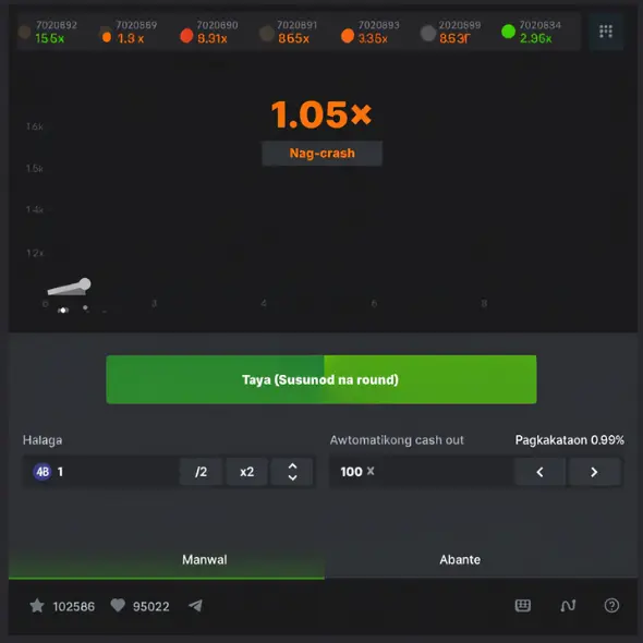 • Pag-unlad ng gameplay . Ang isang multiplier, simula sa 1.00x sa simula ng laban, ay mabilis na umaalis. Tinutukoy ng multiplier ang proporsyon na maaari mong mabayaran kaugnay ng iyong taya.
