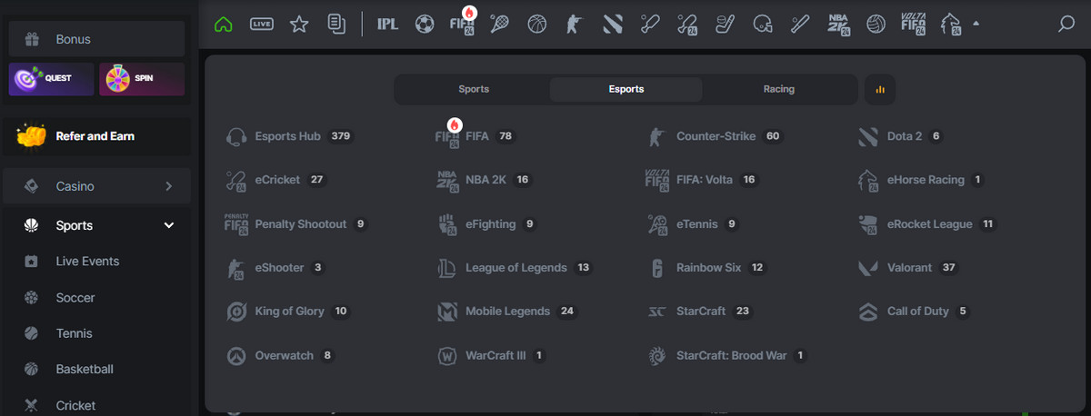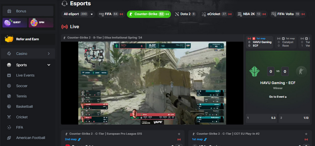 - Komprehensibong mga uri ng taya . Maaaring makisali ang mga user sa iba’t ibang taya gaya ng nagwagi sa laban, kabuuang iskor, mga resultang partikular sa mapa, at mga in-play na aksyon tulad ng unang koponan na nakamit ang isang partikular na layunin sa laro. Ang hanay na ito ay tumutugon sa parehong baguhan at may karanasan na mga bettors.