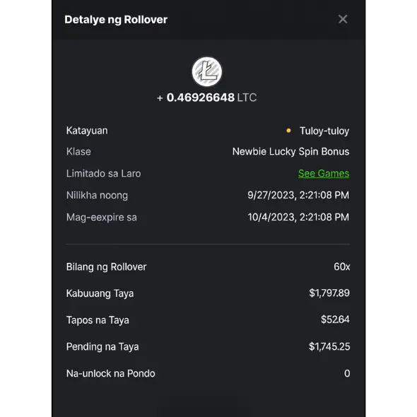• Kinakailangan sa pagtaya . Ang mga Panalo mula sa Lucky Spin ay may kasamang kinakailangan sa pagtaya. Bago mailagay ang withdrawal, ito ay dapat na nakataya ng 60 beses. Tinitiyak nito ang patas na paggamit ng tampok na pang-promosyon at pinapahusay ang user na maglaro ng iba pang mga laro na makikita sa platform.