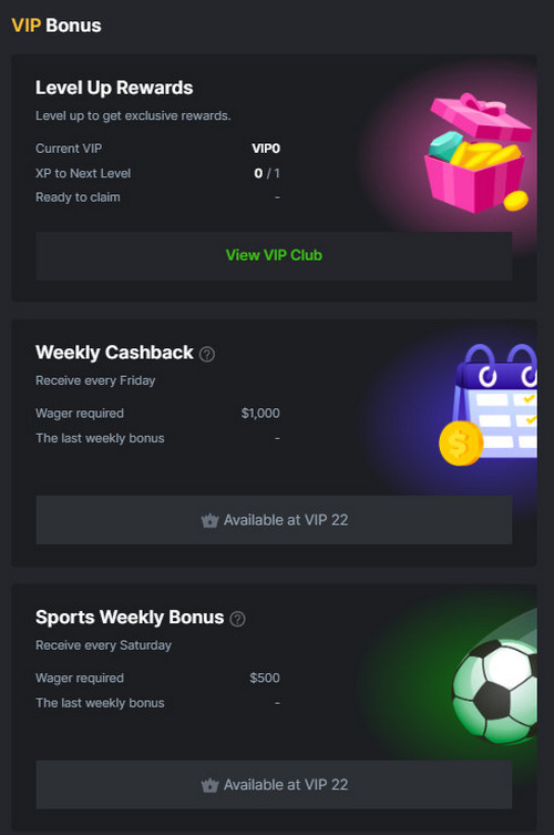 - Eligibility. A player can access the Weekly Bonus after reaching the VIP level of 22. This is in a bid to ensure the bonus is only accessible to committed and serious players.